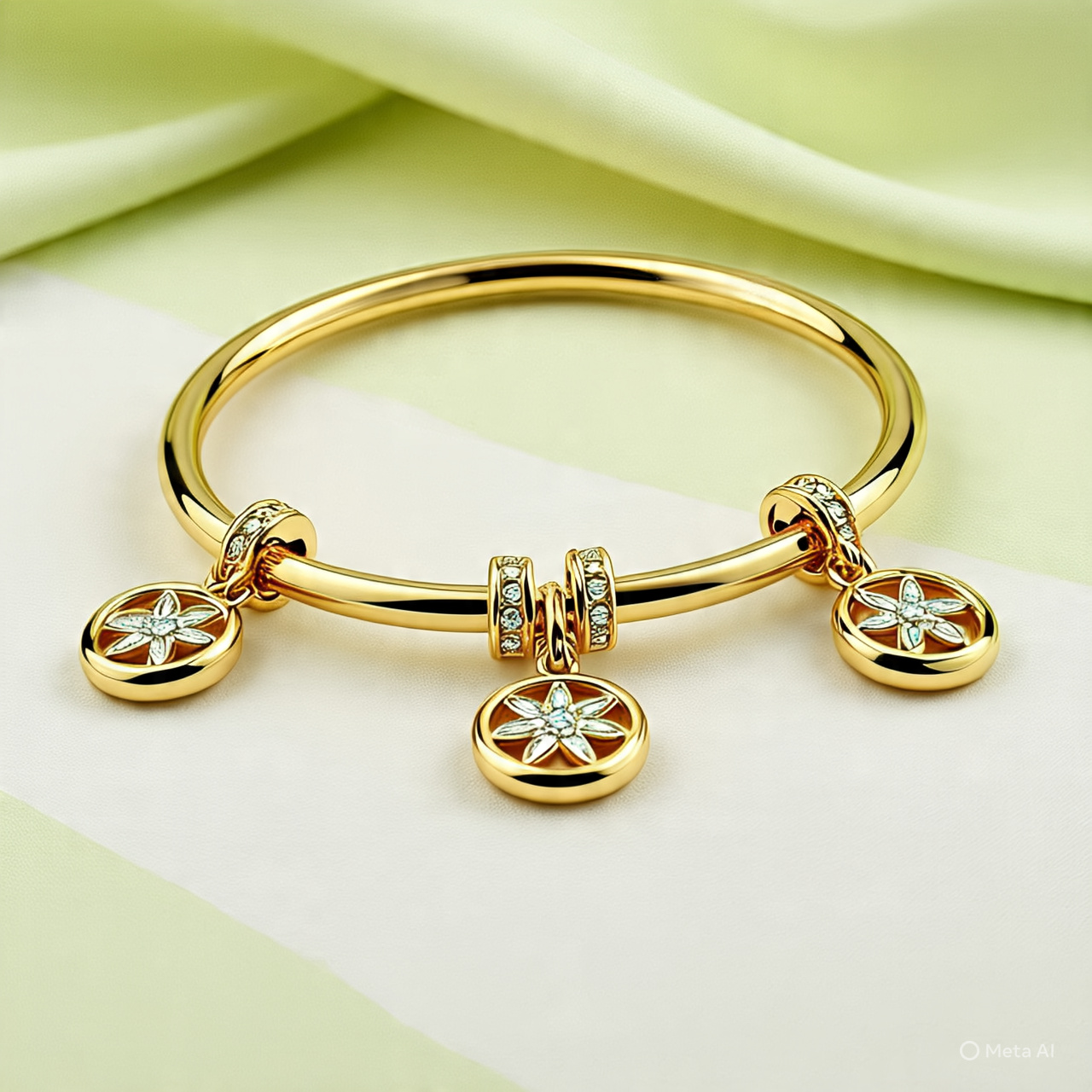 Elegant 18K Gold Bracelet with Diamond Accents. A high-end 18K yellow gold bracelet featuring sparkling diamond accents, photographed on a soft cream satin backdrop.